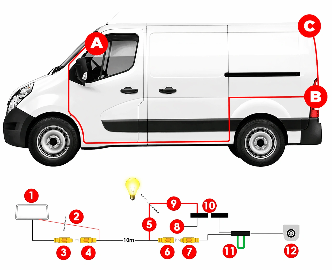 5️⃣ Czerwony przewód – połącz z przewodem nr 9, a następnie podłącz do +12V światła wstecznego.