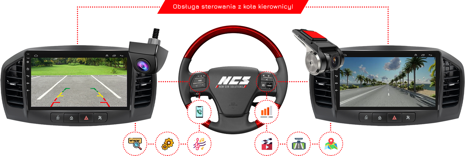 > Odbieranie informacji z CAN-BUS’a (ustawianie sterowania funkcjami z kierownicy, wyświetlanie informacji o spalaniu, przebiegu, wyświetlanie komunikatów o niedomknięciu drzwi, temperaturze, sterowanie funkcjami radia, głośnością itd.). Zwróć uwagę, że funkcje będą działały tylko w przypadku gdy Twój pojazd posiada odpowiednie czujniki.