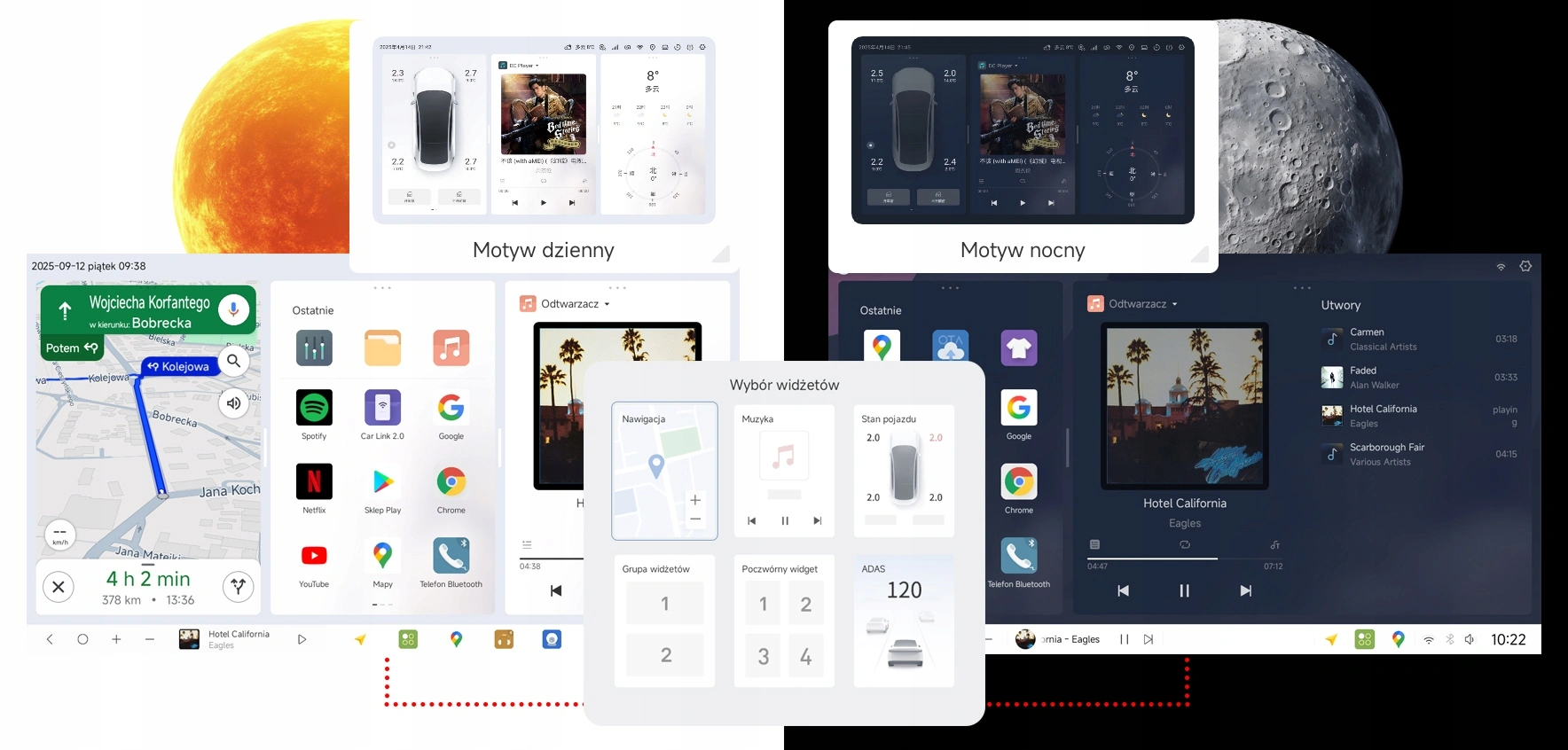 > Tryb dzienny i nocny – automatyczne przełączanie według godziny lub wschodu i zachodu słońca.